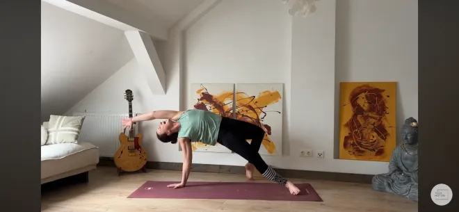 Sanfte, wellenartige Bewegungen mobilisieren Wirbelsäule und Schultern und schaffen Raum im Brustkorb. Aus dem fließenden Rhythmus heraus entsteht Stabilität und Weite. Die Herzöffnung entwickelt sich ganz natürlich – kraftvoll in der Stütze, spielerisch im Ausdruck, frei im Gefühl – bis sich alles in Wild Thing (Camatkarasana) entfaltet.