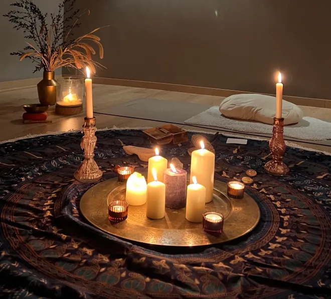 Richte Dir Deinen Platz zu Hause gemütlich ein mit Kerzen, einem Räucherstäbchen und deinem Meditationskissen.